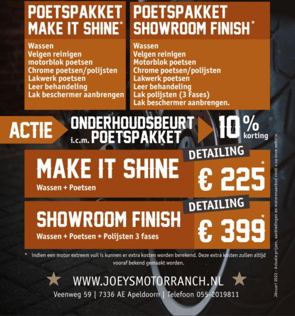 Bij beide pakketten zullen we uw motor grondig wassen en de gehele motor oppoetsen van lakwerk, chroom, aluminium, het motorblok ect.